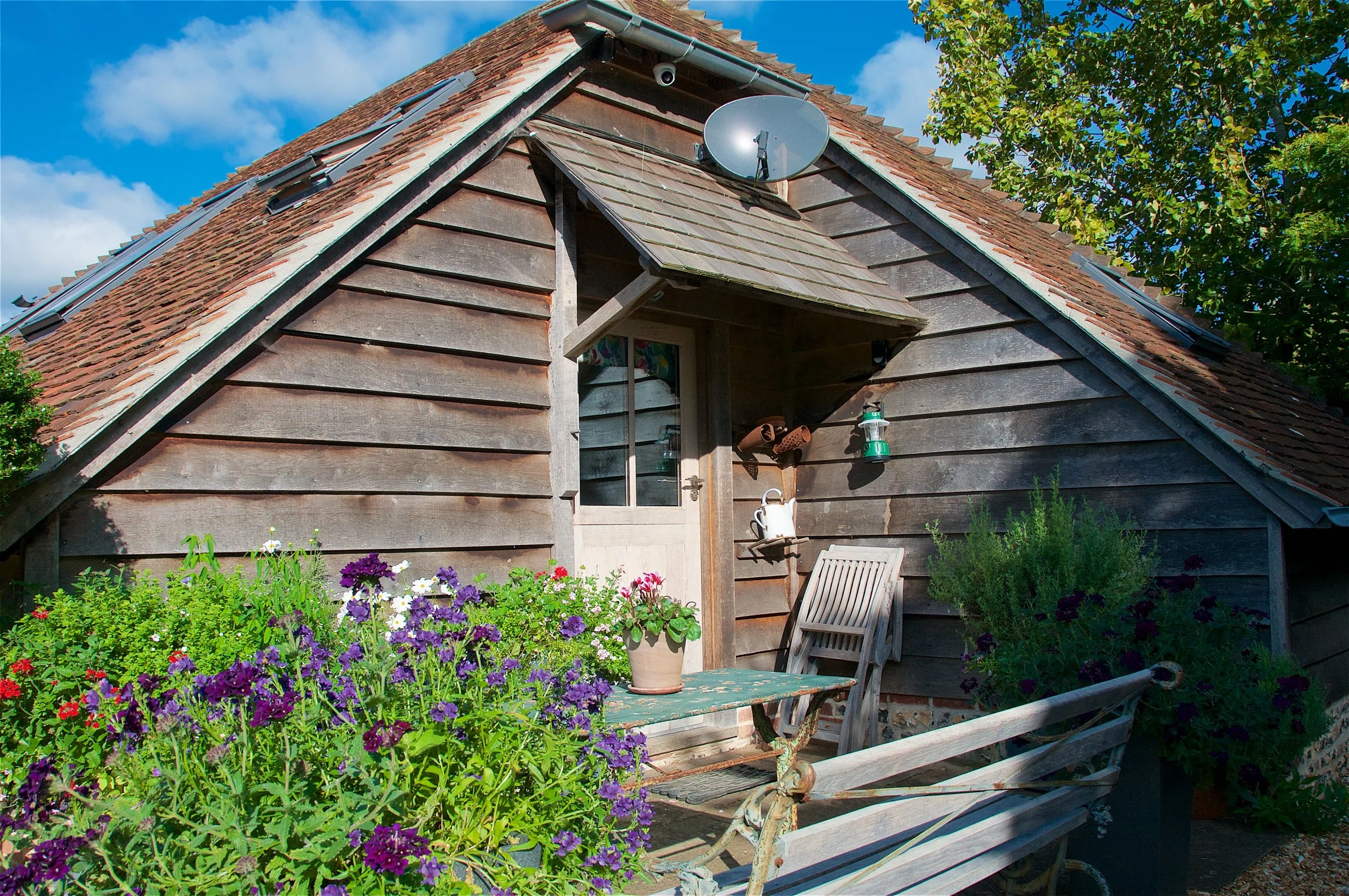 Car-Port / Annexe – Up Marden Built into a high-sided bank with complex drainage needs. Reclaimed tiles and local flint help the structure settle naturally into the landscape.